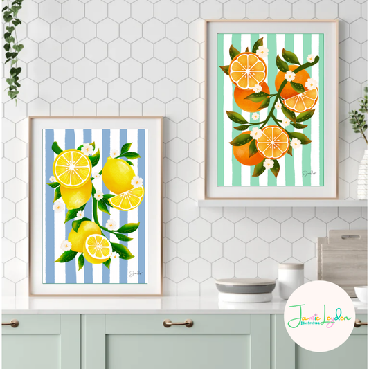 Lemon wall art print with striped background